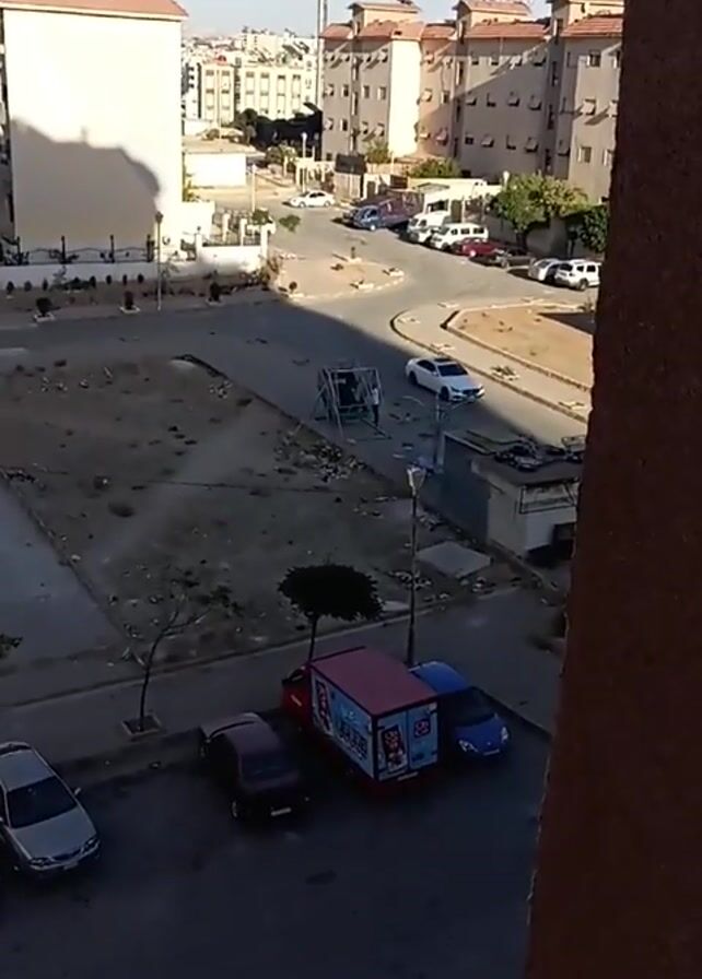 n elevated view of a street intersection in a residential area. Several multi-story buildings with a uniform architectural style surround the intersection, casting long shadows. The intersection is paved, but a nearby dirt patch contains a debris-strewn playground area. A man, dressed in dark pants and a white shirt, interacts with a colorful, octagonal-shaped piece of playground equipment, manually rotating it. Parked vehicles are visible along the street, including a van with commercial graphics and several cars of various colors. The overall scene suggests a sunny day in a densely populated urban neighborhood.