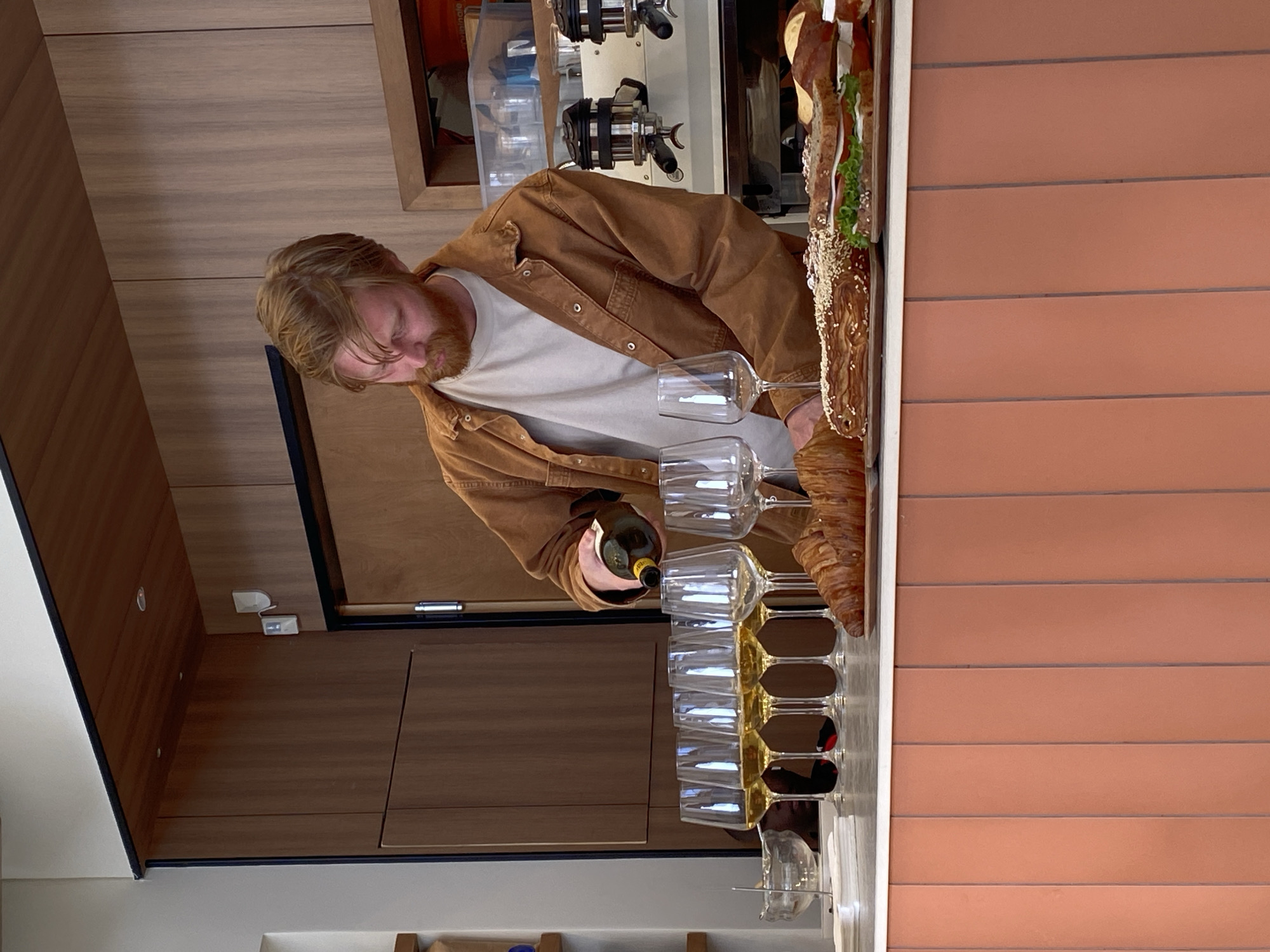 A man is pouring wine into wine glasses in a kitchen, with food arranged on the counter beside him. The kitchen features light brown wood cabinetry and terracotta-colored horizontal paneling. The countertops are light-colored. A row of wine glasses of varying levels of fullness is placed along the counter. A bottle of wine is being held by a fair-skinned man with blond hair and a red beard. He is wearing a light-colored t-shirt and a brown jacket. Beside the man, a sandwich and croissants are arranged. Behind the man, there is a coffee machine in the background. The scene appears to be indoors in Tel-Aviv, Israel.