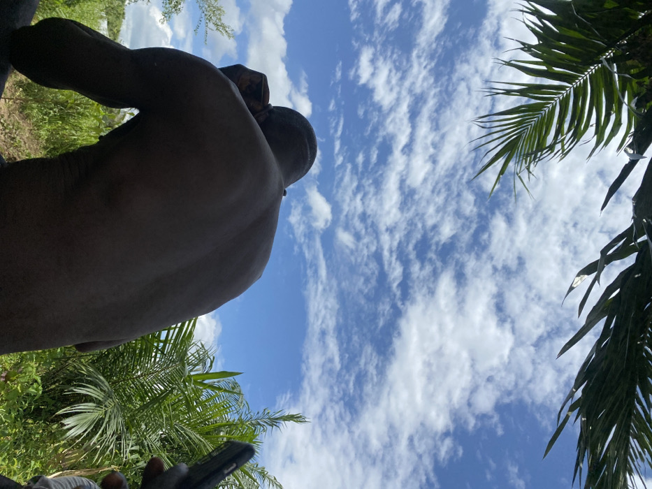 The image depicts an outdoor daytime scene in Ajaokuta, Nigeria, characterized by a bright blue sky filled with numerous scattered white cumulus clouds. Dark green palm fronds are visible at the upper edges of the frame. In the foreground, the bare upper back and head of a dark-skinned individual, likely male, are prominently featured, seen from behind. This individual is shirtless, with their right arm bent and hand positioned near their head/face, partially obscured. The posture suggests they are either resting, seated, or observing. To the far right, a dark-skinned hand holds a black smartphone vertically. The background features dense green tropical vegetation, including broad-leafed plants and additional palm fronds. Sunlight illuminates the scene from above, creating a slight silhouette effect on the main subject.