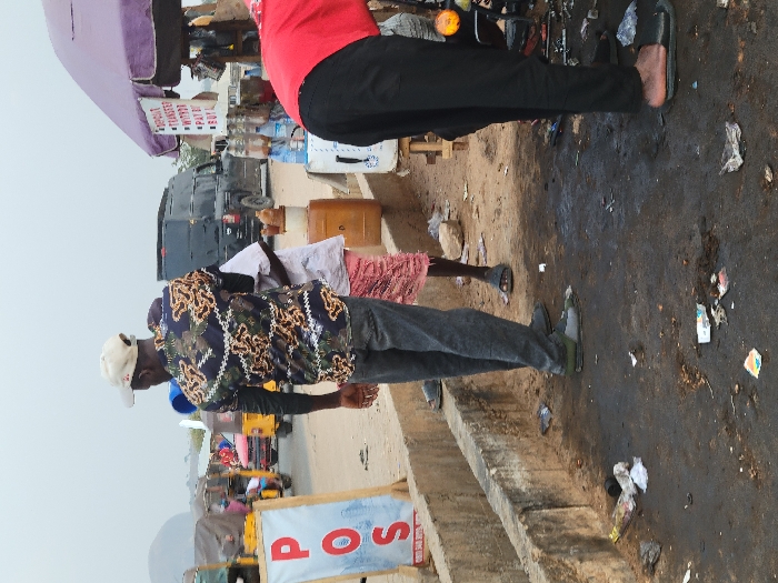 Several people stand near a roadside business. One person wears a red shirt and black pants, another a patterned shirt, gray pants, and a white cap. Nearby is a sign with the word "POS" visible. A purple awning shades a stand filled with items. Behind them, a dark van and a yellow tricycle are parked, suggesting a bustling environment. Litter and debris scattered on the ground highlight an urban or commercial setting.
