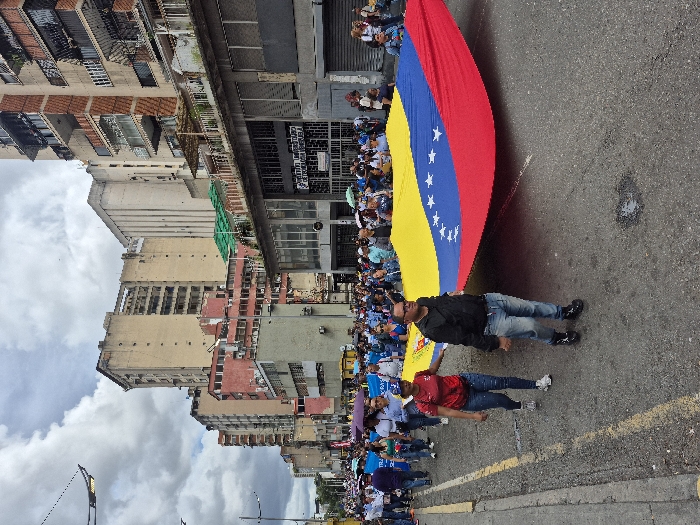 A street scene shows a crowd of people gathered, many wearing blue shirts. Two individuals in the foreground are holding a large Venezuelan flag, its red, yellow, and blue stripes prominent. Buildings flank the street, with various architectural styles and colors. The sky is visible, displaying a mix of clouds. A curb and asphalt street are visible in the lower portion of the frame.