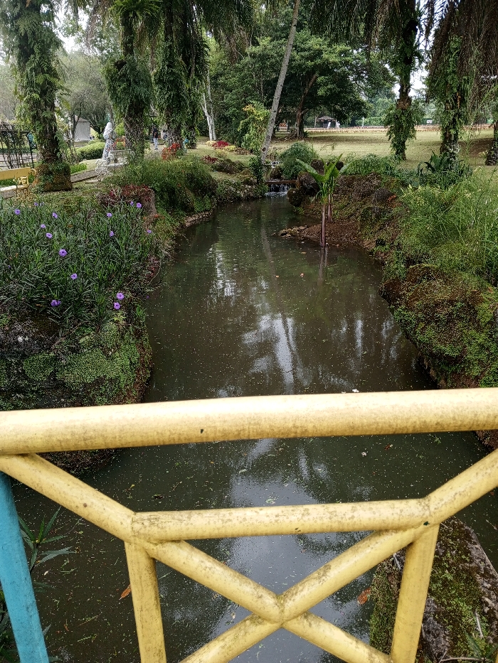 A tranquil waterway cuts through a lush landscape, viewed from a yellow bridge in the foreground. The banks are adorned with greenery, including purple flowering plants and moss-covered rocks. Beyond, towering trees drape with vines, framing the scene. A distant open field with a small structure adds depth to the park-like setting, all reflected in the dark water below.