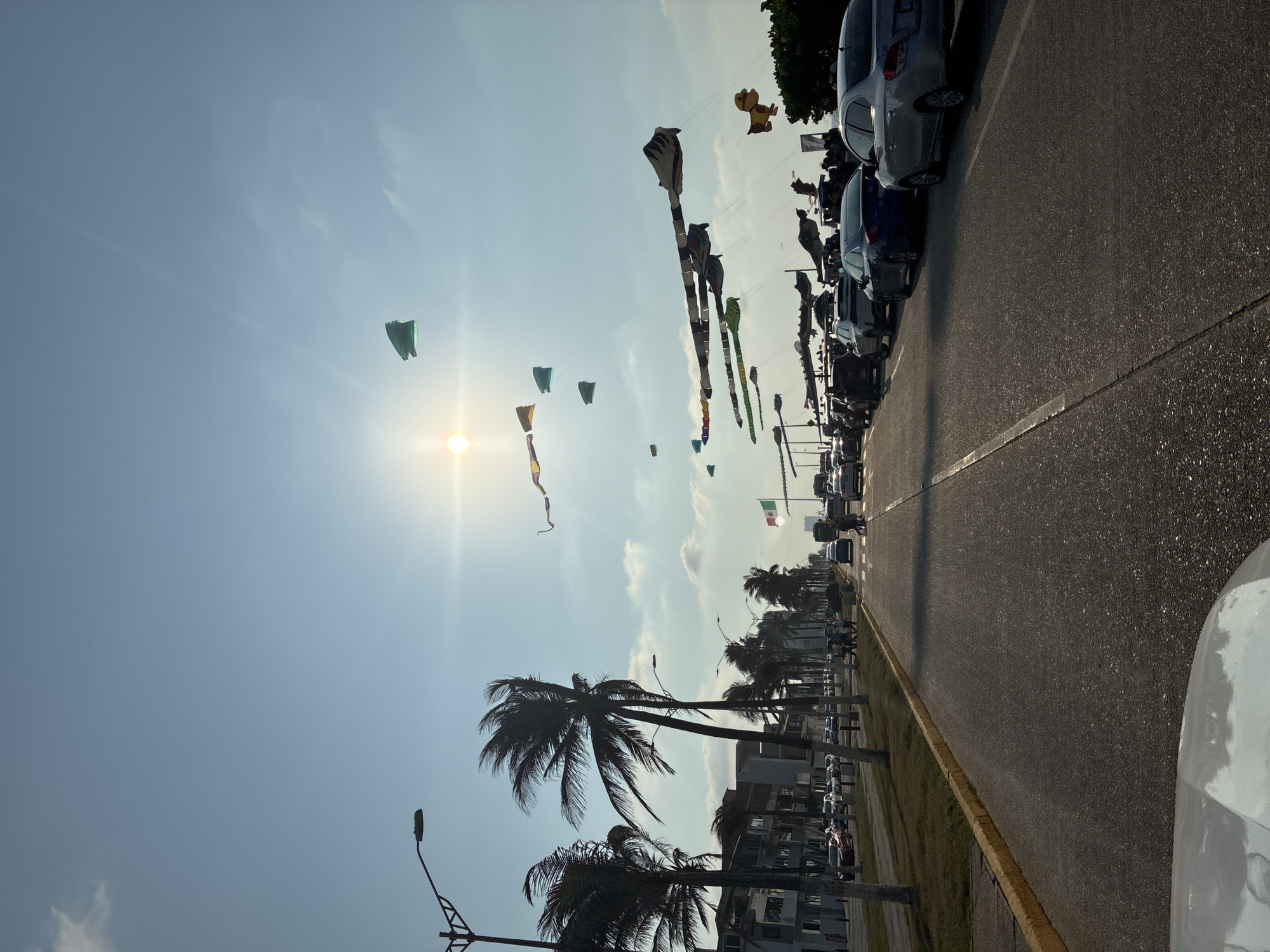 The image displays a daytime scene on a coastal boulevard in Coatzacoalcos, Mexico. A bright sun is visible in the upper-left sky, which is clear blue with scattered white clouds. Numerous kites of various designs, including elongated black and white striped forms, green geometric shapes, and a yellow cartoon dog figure, are airborne at different altitudes. The foreground shows a multi-lane asphalt road, viewed from a low perspective, possibly from a vehicle. A solid yellow curb separates the main roadway from a grassy median on the left. This median is lined with tall palm trees, whose fronds appear wind-swept, and multi-story buildings. Multiple streetlights with double-arm fixtures are also present along the median. On the right side of the road, a line of vehicles, including sedans and SUVs, is either parked or moving slowly. Groups of pedestrians are visible along both sides of the road, particularly congregating near the parked vehicles on the right, appearing to observe the kites. A Mexican flag is partially visible among the trees and crowds on the right side of the road in the mid-ground.