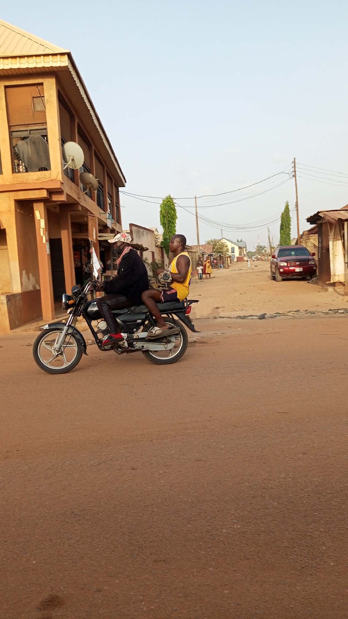 street scene in Sabon Tasha, Nigeria. A black motorcycle with two occupants is in motion on a reddish-brown dirt road. The driver, wearing dark clothing, a patterned hat, and red shoes, is operating the motorcycle. The passenger, wearing a yellow tank top and brown sandals, is carrying an object. Buildings of light brown color with satellite dishes and structures are on the side. In the background, there's a red SUV, other buildings, trees, and power lines. There are other pedestrians further down the road.