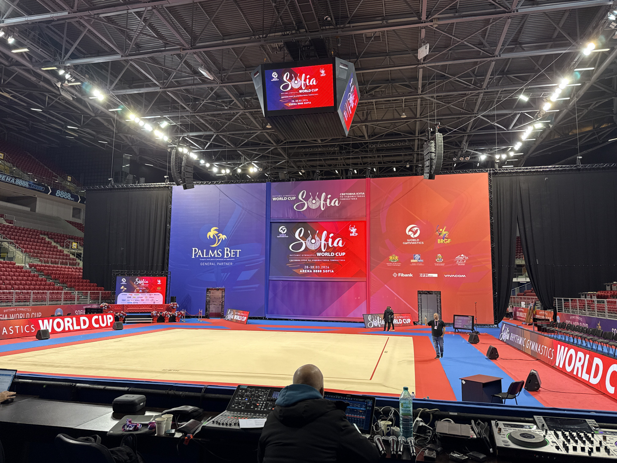 The image depicts an indoor sports arena, specifically Arena Sofia (also known as Arena 8888 Sofia or Arena B8BB Sofia, as seen on displayed signage), located in Sofia, Bulgaria. The scene is set for the Rhythmic Gymnastics World Cup, scheduled for 28-30.03.2024. In the foreground, an individual with a bald head, wearing a dark jacket with a blue hood, is seated at a technical control desk, facing away from the camera. The desk is equipped with an audio mixing console, a laptop displaying an interface, and DJ turntables/players. A water bottle, coffee cups, and various microphones are also on the desk. The mid-ground features a light-colored gymnastics mat with red and blue borders, positioned on a larger red and blue carpeted floor. Beyond the mat, a prominent, multi-paneled LED backdrop displays "Sofia Rhythmic Gymnastics World Cup," event dates (28-30.03.2024), "Arena B8BB Sofia," and various sponsor logos including Palms Bet, World Gymnastics, BRGF, Fibank, Vivacom, and DPM. Red and blue floral arrangements are visible at the base of the central backdrop section. On the arena floor to the right of the mat, an individual in a dark jacket stands facing the backdrop. Further right, another individual is seen near an LED display showing event scores. An LED banner runs along the side of the floor reading "RHYTHMIC GYMNASTICS WORLD CUP." Black drapes and rows of empty black chairs are also visible on the right. The background reveals a large section of empty red stadium seating on the left, receding into partial darkness. Overhead, a complex metal truss structure supports numerous bright white stage lights, speakers, and a large, cube-shaped LED scoreboard suspended from the ceiling, which also displays "Sofia World Cup" information. The overall environment is a large-scale indoor stadium set up for an international sporting event, well-lit over the central performance area.