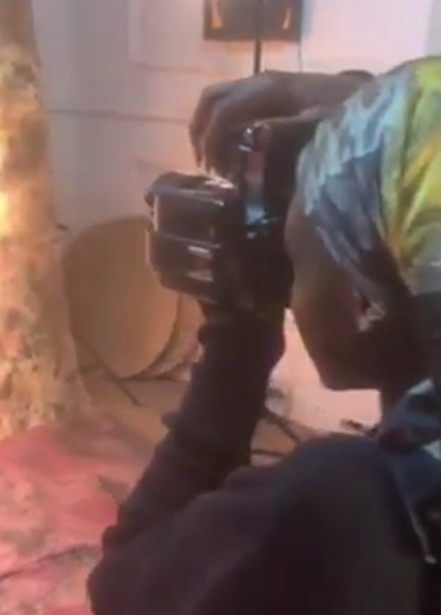 A person with dark skin, wearing a headscarf and dark clothing, is taking a video with a black video camera. The individual is crouched and aiming the camera towards someone seated out of focus in the background. There is a backdrop, a light on a stand, and a patterned wall behind the camera operator. The scene appears to be indoors, possibly a studio or a room set up for filming.