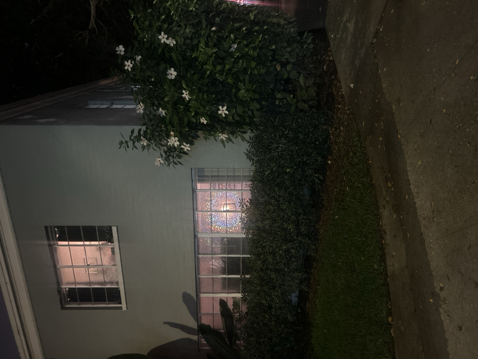 The image depicts the exterior of a two-story building at night, consistent with an urban or suburban setting in Los Angeles, United States. The structure features a light grey or pale green facade. On the first floor, a wide multi-pane window is visible, through which an internal light source casts a pinkish glow and illuminates a distinct circular, iridescent or holographic pattern. A dense, dark green hedge obscures the lower portion of this window. Above it, on the second floor, a smaller multi-pane window reflects a similar pink light. To the right of the building's corner, a large, dark green shrub bearing numerous white flowers is present. In the immediate foreground, a strip of green grass borders a concrete sidewalk that runs horizontally across the lower frame. The overall environment is dark, indicating nighttime, with artificial light emanating solely from within the building. No individuals or active interactions are visible.