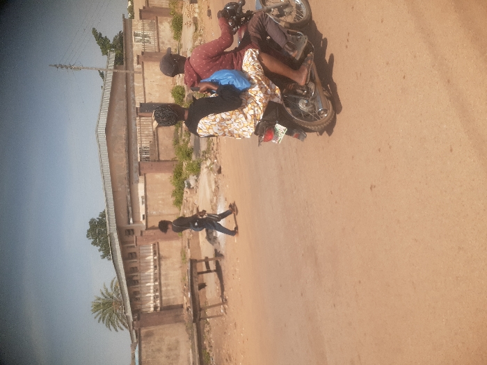 The image depicts an outdoor daytime scene on an unpaved or poorly maintained road in an unidentifiable area of Jos, Nigeria. In the foreground, two individuals are riding a dark-colored motorcycle from right to left, viewed from behind. The driver, wearing a dark cap and a reddish-brown long-sleeved top, operates the vehicle. The passenger, seated behind, wears a patterned white, yellow, and black dress or tunic, a black head covering, and carries a bright blue backpack. Their bare feet, wearing sandals, are visible resting on the motorcycle's footpegs. To the left of the motorcycle, a solitary individual walks from left to right across the dusty road. This person wears a dark top, dark trousers, and dark footwear, appearing to carry an item in their left hand. The road surface is primarily reddish-brown dirt or compacted earth, exhibiting minor irregularities and visible tire tracks. On the left side of the road, near the pedestrian, an old wooden table, possibly a vendor's stand, is visible. Scattered debris and small patches of sparse vegetation are present along the roadside. In the background, a long, single-story building with a light-colored, possibly beige or light brown, facade and a grey corrugated metal roof spans the width of the frame. This building is set behind a low wall, which serves as a fence. The fence is constructed of light brown concrete or plaster, featuring darker reddish-brown pillars and vertical dark metal bars along its top. Behind the building, a tall palm tree is visible on the far left, and other green foliage appears further to the right. A utility pole with power lines stands on the right side of the frame, behind the motorcycle and near the background building. The sky is a light blue with some visible haze.