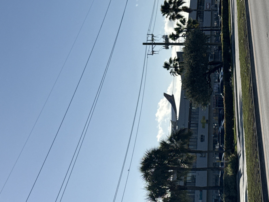 The image displays an outdoor scene under clear daylight conditions in the City of Unknown, United States. A large passenger aircraft, consistent with a Boeing 747 model and featuring a dark tail fin with a light emblem, is present in the mid-background, appearing to be in flight at a low altitude above a two-story commercial building complex. The sky is predominantly clear blue, traversed by multiple overhead utility lines, and a small bird is perched on one of these lines on the left. The commercial building, featuring multiple storefronts, is fronted by a parking lot containing several dark-colored vehicles. Numerous palm trees and a deciduous tree are situated in the mid-ground, partially obscuring the building and parking lot. A utility pole equipped with transformers stands on the right side of the frame. The foreground includes a paved road surface and a grassy median with a manicured hedge. No individuals are distinctly visible.