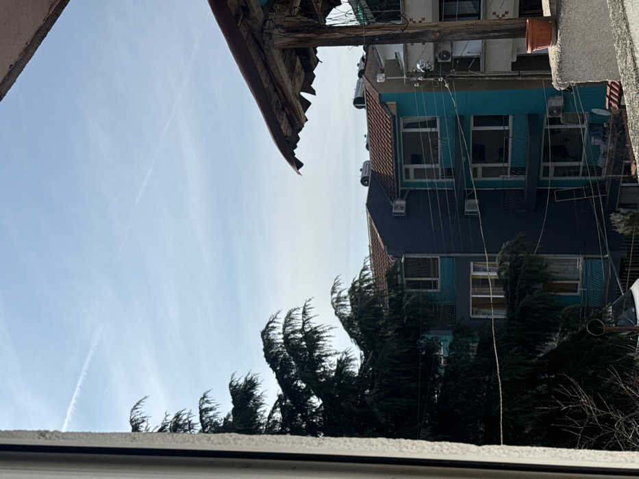 A static outdoor scene depicts a residential area in Kiten, Bulgaria, viewed under a clear, light blue sky with faint white contrails. The perspective is from an elevated position, with a portion of a white window frame visible on the far left. A large, dark green coniferous tree dominates the left side, partially obscuring multi-story residential buildings behind it. The buildings feature terracotta-tiled roofs, with facades painted in a combination of dark grey and bright turquoise. Multiple windows are visible, some with dark-railed balconies. Several solar water heaters are mounted on the rooftops, and exterior air conditioning units are affixed to the walls. Utility cables crisscross the midground horizontally, connecting to a wooden utility pole positioned on the right side of the image. From the upper right, a dilapidated structure with a rusty, corrugated metal roof and exposed wooden supports extends into the frame. On a concrete ledge in the lower right, a single, empty orange terracotta plant pot is visible. A portion of a white vehicle, possibly a van, is discernible behind a fence in the lower-left corner, largely obscured by the tree foliage. No individuals are present or engaged in any actions within the scene.
