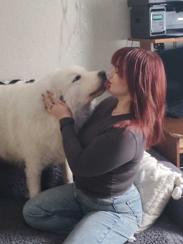 - "An interior scene within a residence in Rostov-on-Don, Russia, depicts a female subject interacting with a large white dog" by FM-9vPRQ2, licensed under CC BY 4.0