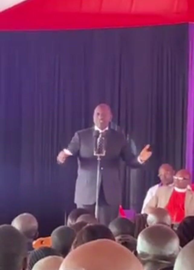 A man in a suit is speaking from a stage to a crowd. He stands behind a microphone, holding a piece of paper, and gestures with his hands. Behind him are two men in religious clothing sitting in chairs. The stage is decorated with red and purple fabric. The crowd appears to be mostly men.