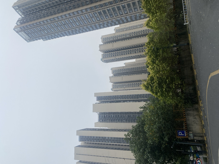 Multiple high-rise buildings dominate the skyline under a hazy sky. Trees line the street beside the buildings, with a section of pavement and a yellow road marking visible. A parking sign and traffic light are also present. The image is oriented with the sky at the left.