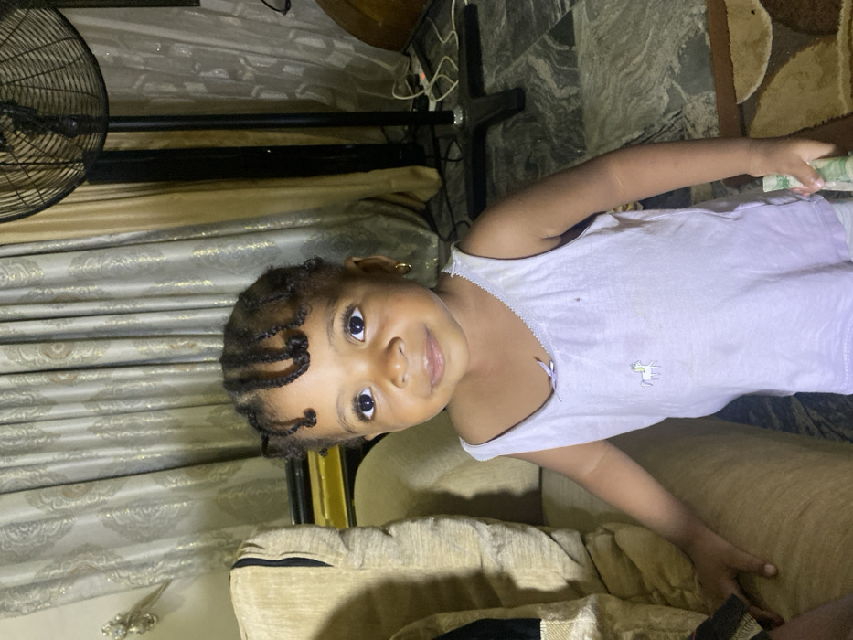 A young child with braided hair, wearing a white tank top with a unicorn emblem, smiles at the camera. She is seated on a tan cushioned chair or sofa. A black fan stands to the left, partially obscured by a light-colored curtain. A patterned rug and a dark tiled floor are visible in the background.