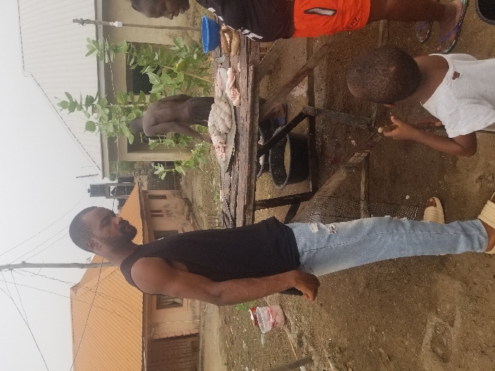 The scene takes place in Pati Ridge, Nigeria, at the coordinates 7.81 latitude and 6.704 longitude. A man wearing a black tank top and blue jeans stands facing a wooden table, his back to the camera. On the table is a large pile of raw, uncooked meat, presumably chicken, and two blue plastic basins. A second man wearing a dark blue tank top and khaki shorts is standing by the table, facing away from the camera, his back is to the viewer, he appears to be looking at the meat on the table. There is also a woman wearing a black shirt and orange shorts standing behind the table, facing away from the camera, her back is to the viewer, she is looking at the meat. A young boy wearing a white shirt and black shorts stands near the man in the black tank top, he is looking towards the meat on the table, holding a stick in his right hand. Behind the group of people is a brown wooden table and a large tree. There are several residential buildings in the background, with brown, orange, and white exteriors. The ground is dirt and a small red and white plastic container is visible in the foreground. The scene is a street-side food market with a general sense of activity and business. The weather appears to be overcast, with a faint light in the sky.