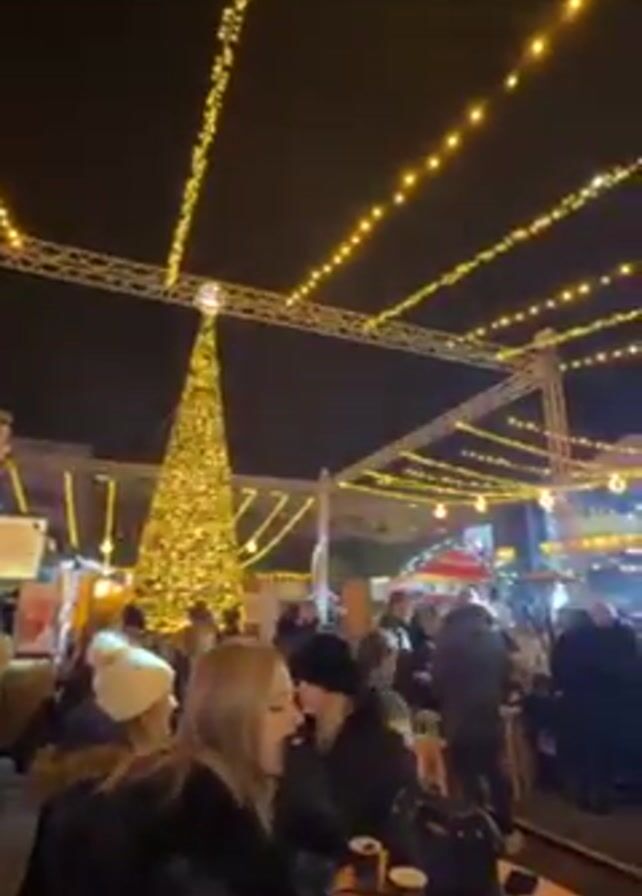 crowded outdoor Christmas market at night. A tall Christmas tree covered in lights stands in the center. People are walking around, eating and drinking at small tables. Strings of lights hang overhead, and a stage with a band playing can be seen in the background. The scene is festive and lively.