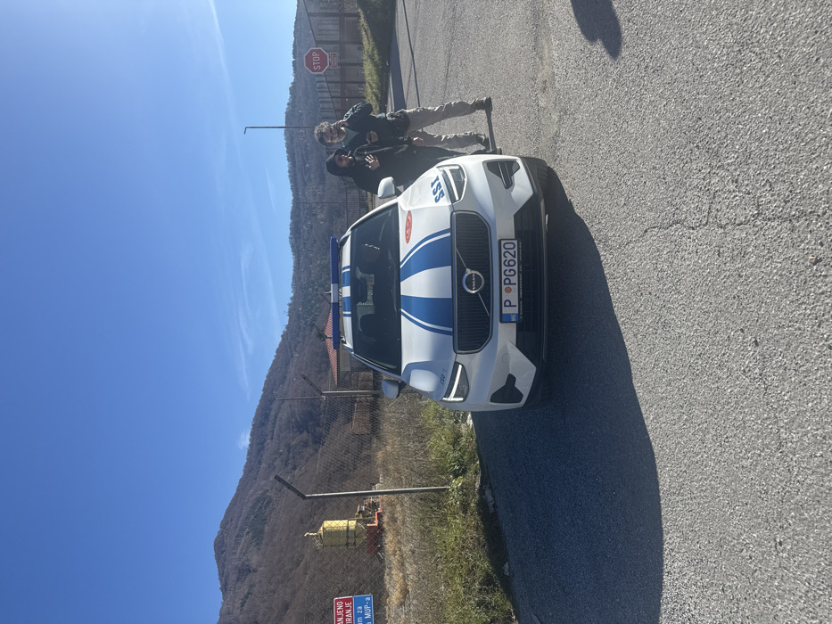 The scene is set outdoors on an asphalt road in Bakovići, Montenegro, under a clear blue sky. A white Volvo compact SUV, bearing a blue and white striped livery on its hood and roof, is positioned centrally, facing the viewer. The vehicle has "SST" decals on its front and a blue emergency light bar mounted on the roof. The front license plate reads "P PG620". The vehicle casts a distinct shadow onto the road surface to its left. Two adult males are standing on the asphalt to the right of the vehicle's front passenger side. The male closer to the car is wearing a dark hooded jacket and dark pants, and appears to be holding a small dark object in his hands. The second male, standing slightly behind and to the right of the first, wears light-colored (khaki) pants and a dark olive-green jacket, and has dark, curly hair. He is holding a smartphone to his left ear, seemingly engaged in a conversation. To the left of the vehicle, a chain-link fence runs horizontally. Behind this fence, overgrown grass and sparse vegetation are present. A large, yellow, cylindrical industrial structure, possibly a silo or tank, with a prominent red base mechanism, is visible. A red and white sign attached to the fence is partially visible, displaying "ZABRANJENO SNIMANJE" (NO FILMING) and "MUP-a" (Ministry of Interior). To the right of the vehicle, the chain-link fence continues. A red octagonal STOP sign is visible on a pole, and a street light pole stands further in the background. The background beyond the fence lines consists of steep, rolling mountains covered with mostly bare deciduous trees, suggesting a non-summer season. The asphalt road shows minor surface cracks. The scene is illuminated by bright daylight, producing sharp shadows.
