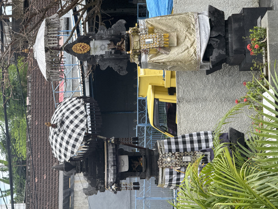 Two ornate stone structures, likely shrines or altars, stand in front of a gray wall. The lower structure features a black-and-white checkered cloth and a matching umbrella, while the upper one is draped with a beige cloth. A yellow truck is partially visible behind the structures through a blue metal fence. Green plants and red flowers are partially seen at the right, while the top left reveals branches of a tree and a tiled roof in the background. The image appears to be rotated counter-clockwise.