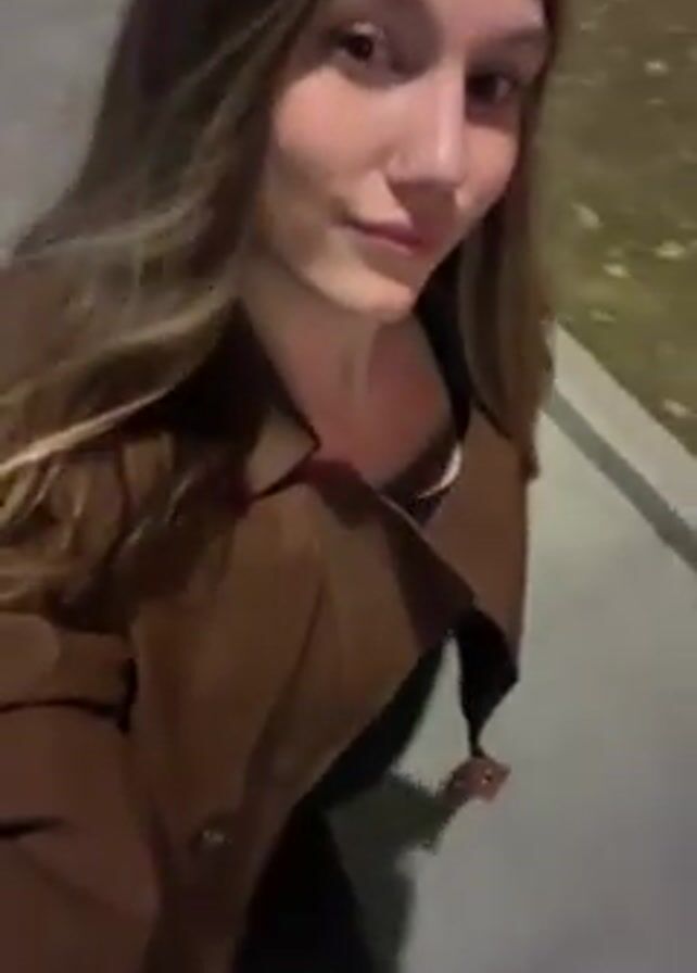 A young woman with long, light brown hair is walking on a sidewalk at night. She is wearing a brown coat and a black top. The street is lit with streetlights, and there are buildings in the background. The camera is handheld and moves with the woman.