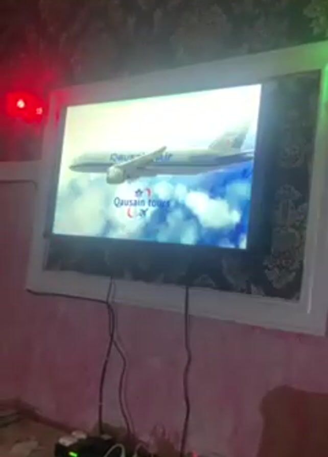 A television screen mounted on a pink wall shows the logo for Qausain Air and the words "Qausain tours." The screen then displays a multicolored airplane and the word "Qausain" in a circular logo. "Madubin Zamani" appears below. Below the screen on a shelf are several electronic devices and cables. The wall above the screen has patterned wallpaper. A small red light is visible above the screen on the left.