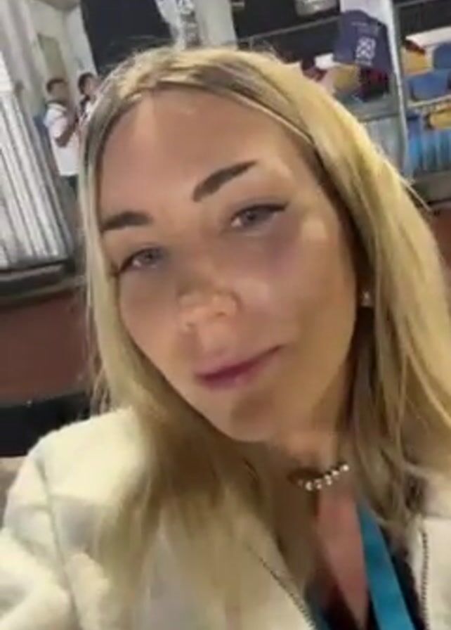 A blonde woman holds up a phone and records herself. She wears a white fuzzy jacket, a pearl necklace, and earrings. Behind her, a street bustles with activity at night, with buildings, banners, and people visible. Loud music can be heard.