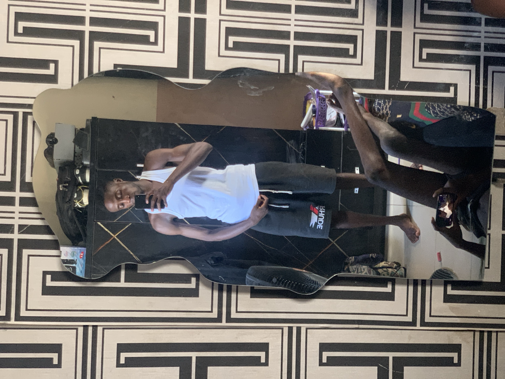 An indoor scene in Osara Gada, Nigeria, depicts a dark-skinned male subject captured in a full-length, irregularly shaped mirror selfie