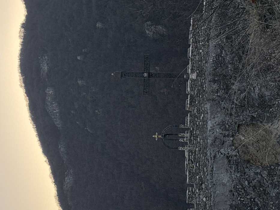 The image depicts a scene in Mihalkovo, Bulgaria, under twilight or dawn conditions with a pale yellow-orange sky gradient at the horizon. The foreground features a multi-tiered stone structure. The lower section is a dark, rough-hewn stone wall with visible mortar and damage. Above this is a lighter grey stone wall with a crenellated top, constructed from rounded stones. Positioned on or immediately behind this upper wall are two significant religious structures. To the left, an open, domed edifice with three dark metal supports stands on a stone base, topped by a small golden Christian cross. To the right, a tall, dark, ornate metal Christian cross rises prominently, featuring intricate patterns along its shaft and arms. A white, winged bird, likely a stork, is perched at the apex of this large cross. The background consists of a steep mountain or large hill, densely covered with leafless deciduous trees, indicating a winter or early spring season. Several lighter-colored rock formations are visible on the hillside. A smaller, light-colored Christian cross is discernible on the lower slopes of the mountain, positioned to the left of the primary structures. No human subjects or explicit actions are present in the scene, which is dominated by natural and religious elements.