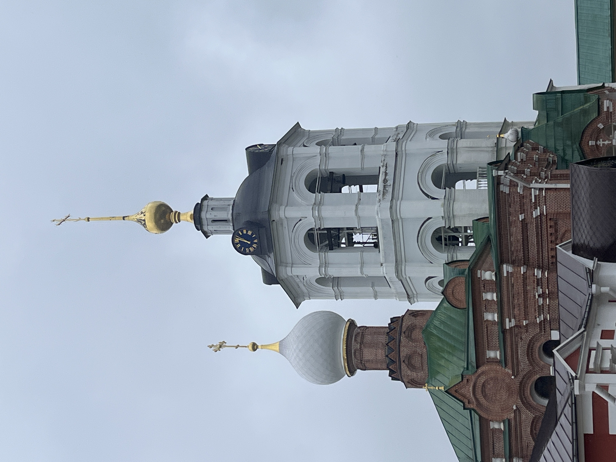 The image depicts two prominent architectural structures against a gray sky. The taller structure appears to be a white, multi-tiered bell tower with arched openings and a golden spire topped with a cross. To the side and slightly below, is a building with a white dome topped with a golden spire and cross, green roofing, and brickwork. The architecture suggests an Orthodox church or cathedral. The location is Луговой, Russia. There are no people visible in the image.