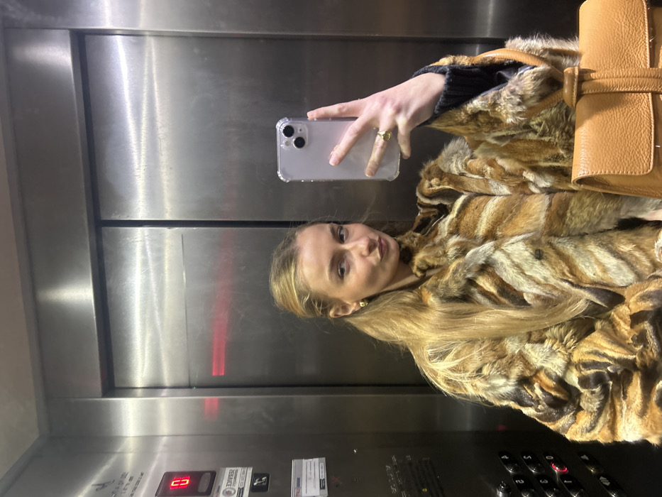 A woman takes a selfie in an elevator, facing right. She wears a fur coat and carries a tan leather purse. Her long blonde hair hangs down her shoulder. She holds a smartphone up to take the picture, and her hand is visible. The elevator is silver with dark buttons, indicators, and signage. The elevator floor indicator shows the digit "3." The elevator is brightly lit.
