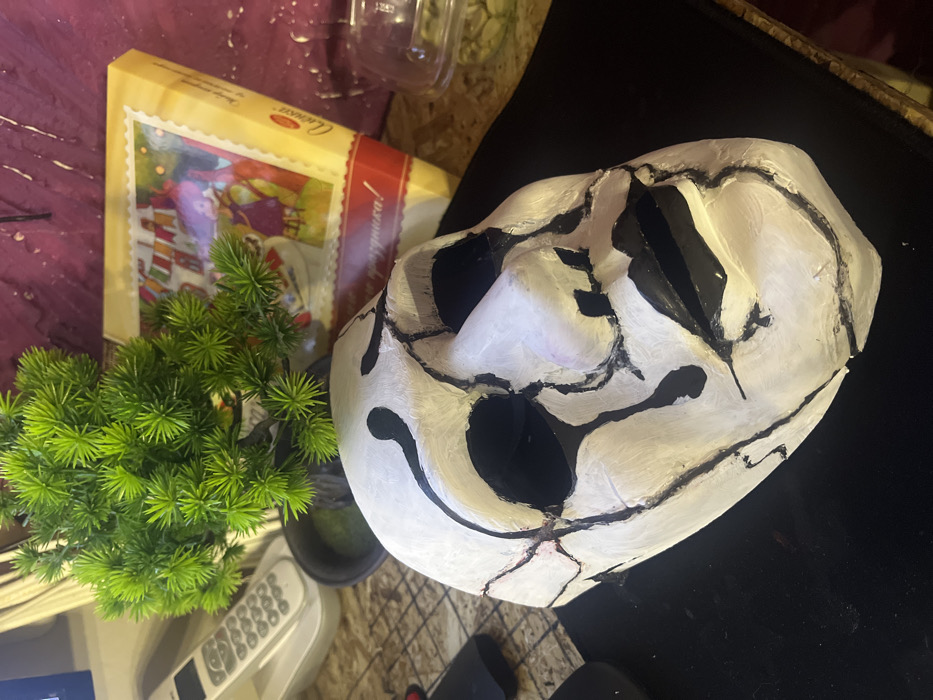 The image displays an indoor scene, likely a desk or table surface, featuring a collection of objects. The dominant subject is a white, stylized human-face mask positioned in the foreground on a dark, flat surface. The mask features irregular black markings resembling cracks and tears below the eye sockets, with dark openings for the eyes and mouth. Behind the mask, an artificial potted plant with vibrant green, spiky foliage is centrally located. To the left of the plant, a white cordless telephone base unit with a handset is partially visible on a light-colored surface. A black computer mouse is partially visible to the immediate left of the mask. To the right of the plant, a rectangular yellow box is present. The box's visible side depicts a festive outdoor scene with colorful bunting and figures. Text on the box, including "Аленка" and "Праздника!", indicates it is a product from a Russian confectionery brand, consistent with the specified location of Saratov, Russia. In the far right background, a clear plastic container with small, light-colored contents is visible against a textured, dark red/purple background, possibly a wall or curtain. No individuals are depicted in the scene.