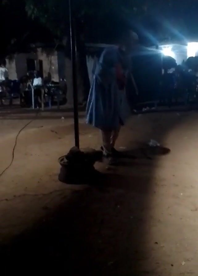 n outdoor scene at night, likely in a village or rural area. The area is dimly lit, with a person standing near a microphone stand in the foreground. A few people are sitting at tables in the background. Some people are standing behind the sitting people. A white tent is visible as well. A sound system is heard, suggesting there may be a performance or public gathering taking place. The ground appears to be dirt or sand.