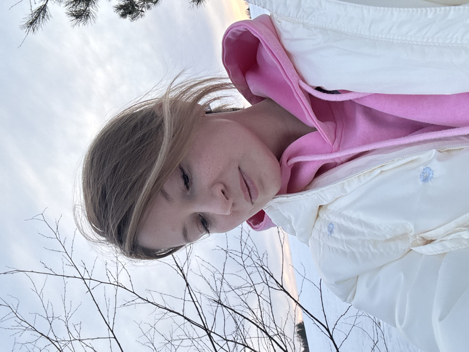 A close-up outdoor portrait features a female individual against a snowy landscape, identified as being in the city of Mishkino, Russia. The subject has light brown hair, fair skin, and is looking downwards with a neutral expression. She is dressed in a bright pink hooded sweatshirt, layered under an off-white, quilted puffer jacket. The jacket exhibits small light blue embroidered floral patterns on the upper chest and shoulder area. The background consists of snow-covered ground, a bare-branched deciduous tree on the left, and a coniferous tree on the right. The sky is overcast with a visible gradient of light blue and soft orange near the horizon, indicative of dawn or dusk lighting conditions.