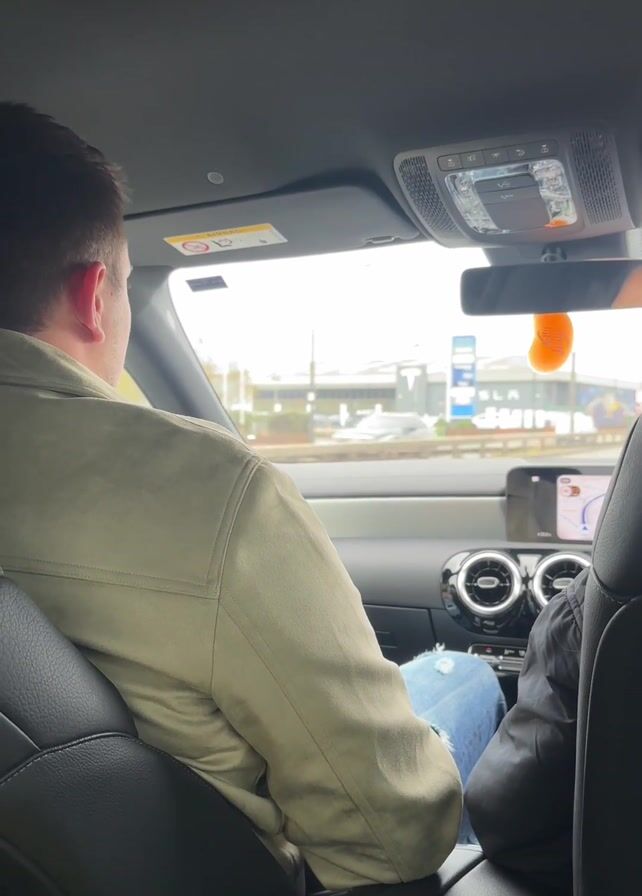 The video depicts the interior of a car, with a man in a light green jacket and ripped jeans driving. He is facing forward, looking through the windshield. In the background, a building with the word "TESLA" on it can be seen. An orange air freshener hangs from the rearview mirror. There is a passenger in the front seat beside him. The car's dashboard is visible, including the air vents and infotainment screen. The seats are black leather.