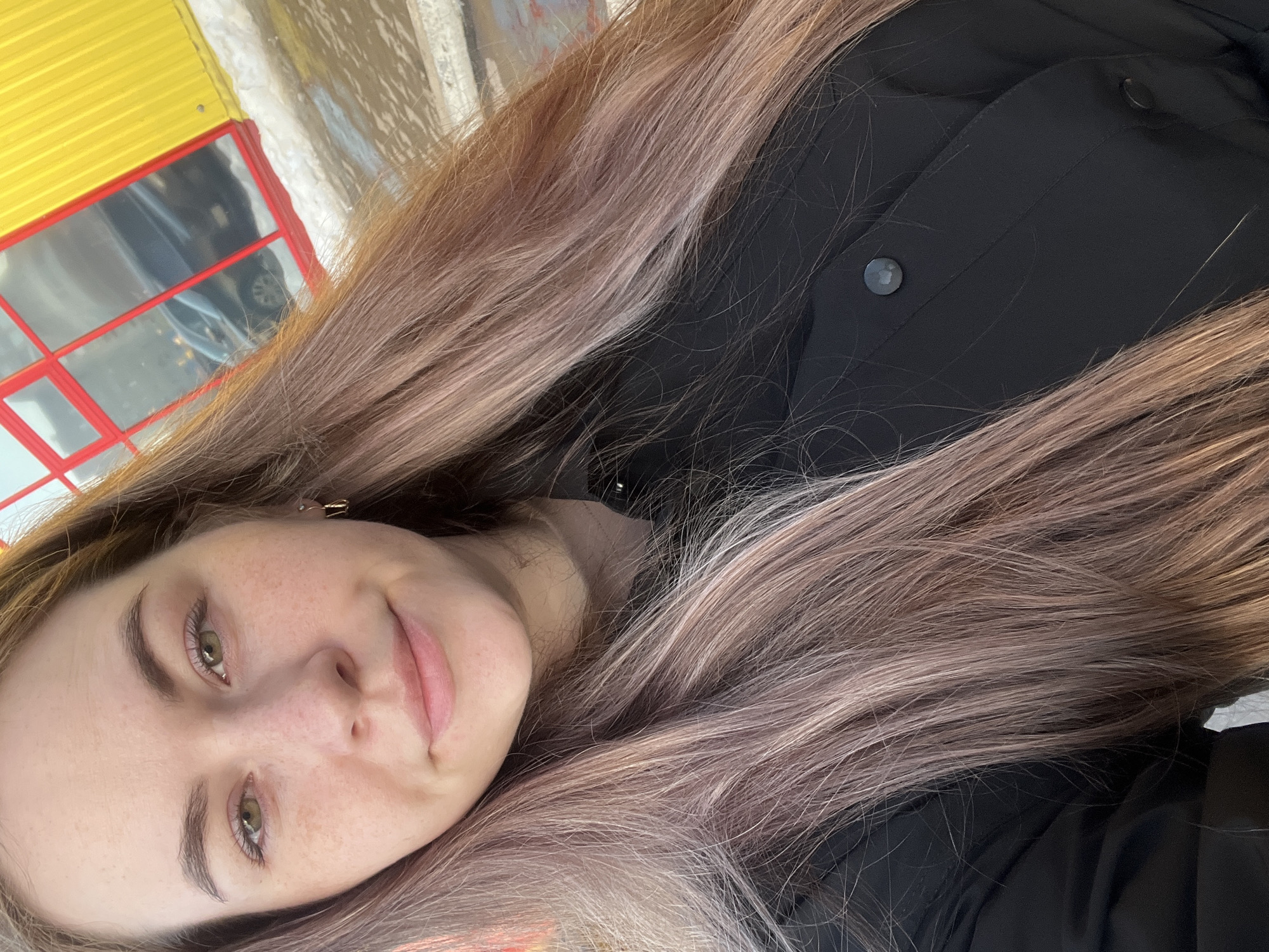 A close-up selfie of a young woman with light skin and long, light brown hair is oriented diagonally
