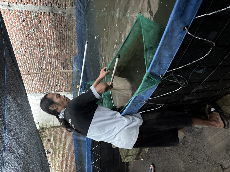 The image displays an outdoor aquaculture facility in Tambakrejo, Indonesia. A male individual, with dark hair tied in a ponytail, wearing a black and light grey polo shirt and dark shorts, stands barefoot in black slide sandals on a wet, dark ground surface. He leans over a rectangular fish pond, actively manipulating a long-handled net partially submerged in a green mesh enclosure within the pond. A second individual's foot, wearing a blue sandal, is partially visible on the far left. The fish pond is lined with blue and black tarpaulin, with ropes secured along its top edge. Two other similar tarpaulin-lined ponds are visible in the background. The environment features a reddish-brown brick wall on the right and a light grey cinder block wall on the left. A black shade net covers the area overhead, and white PVC pipes, consistent with aquaculture water systems, extend over the ponds.