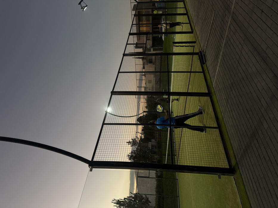A low-angle, rotated shot captures a tennis court enclosed by a wire fence. A man in a blue shirt and dark pants swings a tennis racket on the court. The backdrop features trees and a dusky sky with muted colors. A light illuminates the court, positioned above the fence. The foreground shows the edge of a paved area adjacent to the court. The composition emphasizes the geometric patterns of the fence and the court's artificial grass.