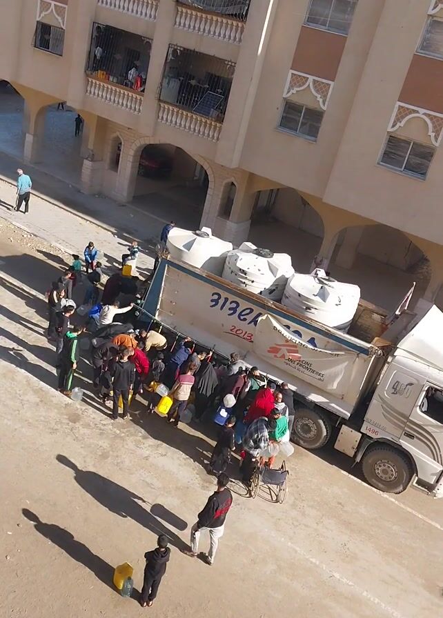 A truck loaded with white objects is parked on a pavement in front of a multi-story building. A crowd of people surrounds the truck bed, and some appear to be receiving or unloading items. Two figures are standing near the truck, one is carrying a yellow container. The setting appears to be an urban area with a sunny climate.