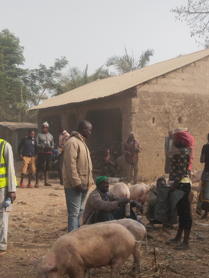 This image depicts an outdoor scene in Unguwan Rimi, Nigeria, characterized by a gathering of individuals and livestock. The environment consists of a dry, unpaved dirt ground, with a large, single-story building constructed from unplastered mud blocks or concrete blocks and a corrugated metal roof positioned centrally in the background. To the left of this main building, a smaller, less distinct structure with a dark roof is partially visible. Scattered trees with green foliage and bare branches are present in the background, with palm fronds visible behind the main building's roofline. The sky is a uniform pale grey, indicating an overcast or hazy condition. Approximately 14 individuals are present in the frame. Most are adult males. * In the foreground, a light-skinned pig with sparse hair is actively grazing or rooting on the ground, facing left. Another lighter-colored pig is partially visible behind it, facing right. * To the left, a person wearing a light-colored suit jacket over a light shirt and a yellow reflective vest holds a clear plastic bottle. * Central in the midground, a man in a light brown jacket and blue jeans stands facing right. * To his right, an older man with a green cap and a light brown shirt sits on the ground, holding a white plastic bottle. Three pigs are visible around him and to his right; two are light pink, one is darker, all standing or resting. * Further right, a person in a dark patterned shirt and dark pants stands, holding a black plastic bag, observing the pigs. * Several other individuals are distributed throughout the scene: two men stand near the smaller building on the left, one in a blue top and shorts, the other in a grey top and dark shorts. Others are standing or partially obscured near the main building's entrance and to the far right. One person is seated inside the shadowed entrance of the main building. The overall scene suggests a rural or semi-urban setting, possibly a local market or a domestic compound, involving animal husbandry or trade.