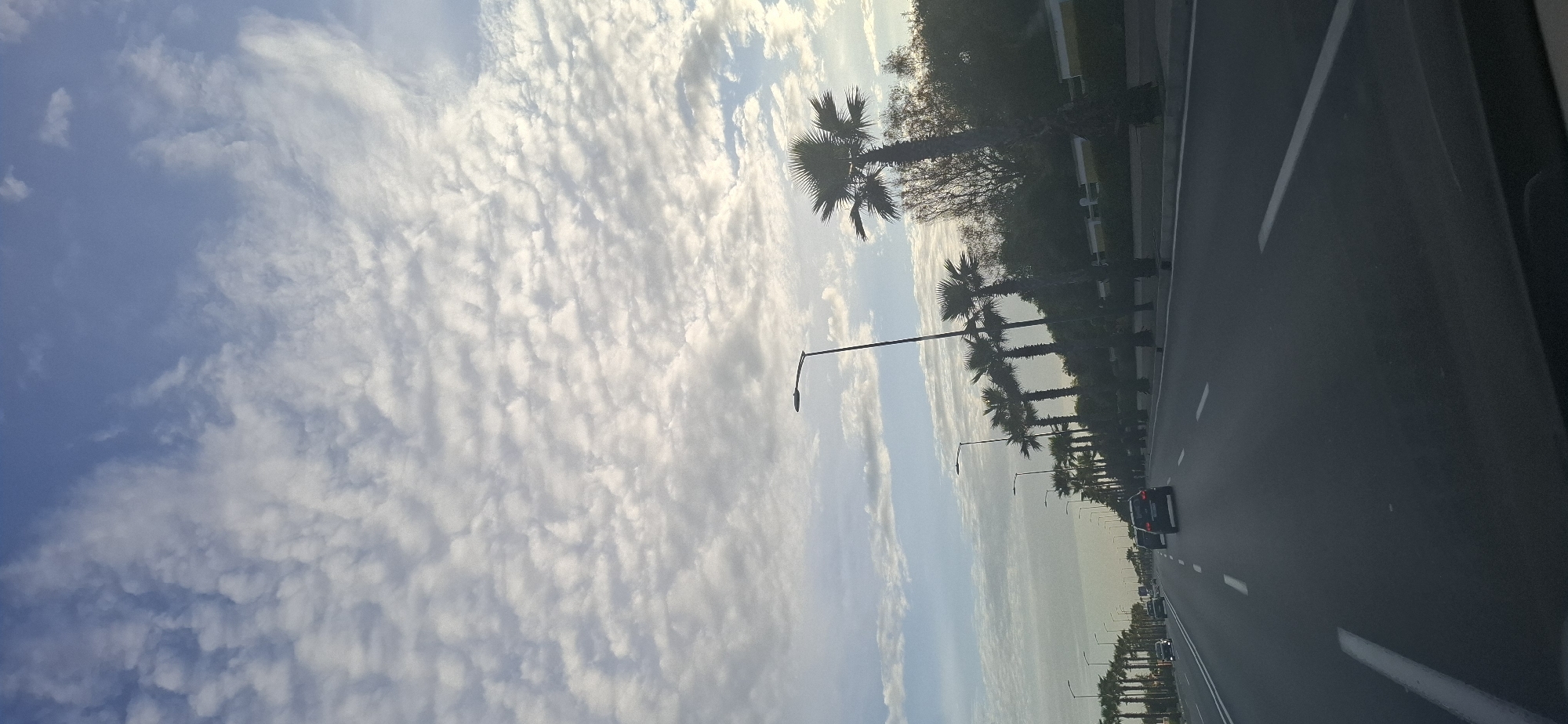 The image depicts a multi-lane asphalt road in Harhoura, Morocco, captured from a low perspective, likely from a vehicle's dashboard. The sky is partially overcast with numerous altocumulus clouds forming a scattered pattern against a lighter blue background, indicative of diffused daylight, possibly late afternoon. The road surface is dark asphalt with clearly visible white solid and dashed lane markings, indicating multiple lanes for traffic flowing in the direction of the camera. A wide median strip separates the road, densely lined with uniformly spaced tall palm trees, estimated to be between 15 to 20 feet in height. Interspersed among these palms are slender, dark-colored streetlights, each featuring a single luminaire. To the right of the road, behind the initial line of palm trees, a low, light-colored barrier or wall is present, followed by a dense expanse of green foliage comprising various bushes and trees. On the left side of the road, an additional row of palm trees and streetlights is visible extending into the distance. Several vehicles are observed on the road, traveling away from the camera. A dark-colored SUV or large sedan is prominent in the middle distance within the left lanes, followed by other less distinguishable vehicles receding further down the road. No pedestrians or individuals outside of vehicles are visibly present within the scene.