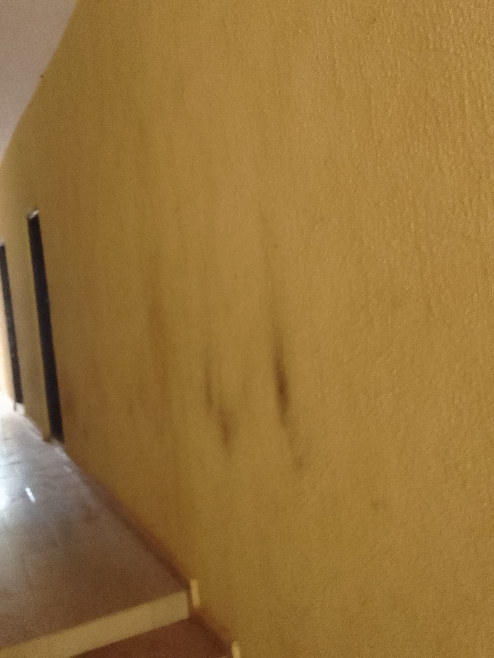 An interior scene in a building located in Ukpor, Nigeria, depicts a mustard-yellow, textured wall occupying the right side of the frame. This wall displays at least six vertical dark brown streaks, consistent with stains from water runoff or dirt accumulation. To the left, a narrow corridor recedes into the background, revealing several dark, rectangular door openings along its left side. The corridor floor appears light-colored, and in the lower-left foreground, a distinct step is visible, featuring a white riser and a brown tread. Light originates from the far end of the corridor, illuminating parts of the floor. No individuals, animals, or explicit actions are present within the frame.