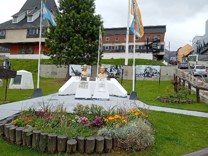 A public park features busts of two men atop white pedestals, flanked by Argentinian flags. Behind them, a wall showcases historical photographs. A vibrant flower bed, encircled by log edging, graces the foreground. Green grass covers the ground. Buildings line the background, and vehicles pass by on the street. The sky is overcast.
