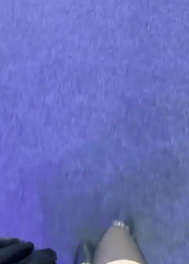 The video begins with a view of a person’s feet as they walk on a purple carpet