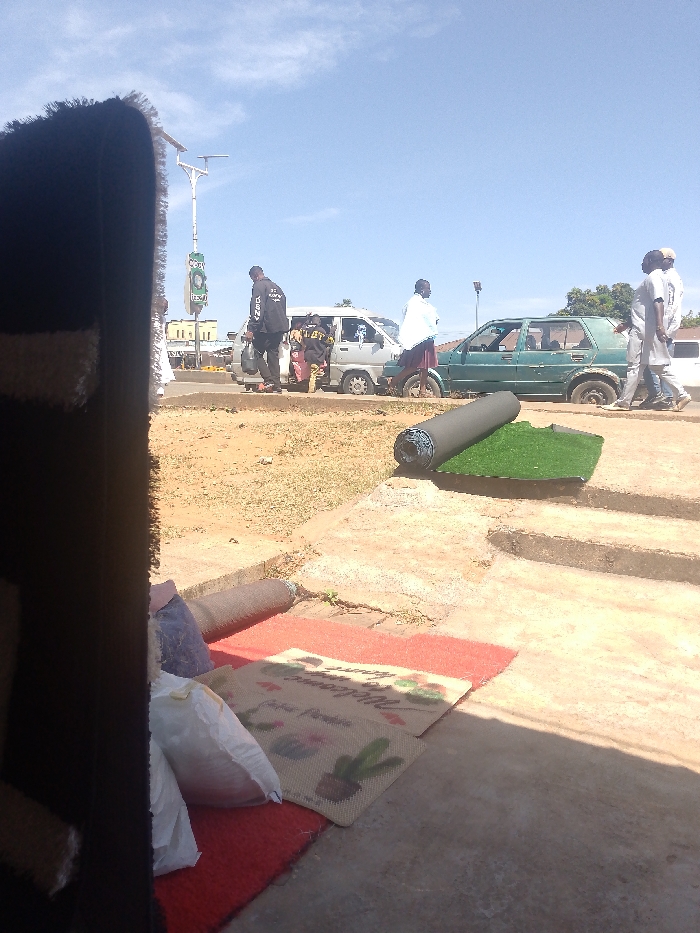 This image captures a daytime street scene in Jos, Nigeria, viewed from a slightly elevated position looking towards a public road. In the immediate foreground, a dark, vertically oriented object partially obscures the left side of the frame. Resting on a red mat are two white sacks and a beige doormat decorated with "Welcome Home" text and cactus designs. Another rolled mat or carpet is visible behind the sacks. To the right, concrete steps lead down to a lower concrete slab where a rolled section of artificial green turf, partially unrolled, rests with its dark underside exposed. Beyond these items, a patch of dry, light-brown earth with sparse vegetation extends towards the paved road. On the road, traffic is visible. A light-colored minivan is stopped or parked, with several individuals, including children, inside. A person in a black shirt with white lettering and dark trousers stands beside the minivan, holding a dark bag. Next to the minivan, a dark green sedan, possibly an older model, appears damaged, with its front wheel area obscured or recessed and a missing driver's side window frame; a person in a white garment stands near it. Further to the right, several individuals in light-colored clothing are walking or standing along the roadside. A tall white street light pole with a solar panel and a green circular sign is prominent in the background, along with a second, darker street light pole further down the road. Distant buildings with light-colored facades are visible across the street. The sky is clear and blue with minimal cloud cover, indicating bright, direct sunlight.