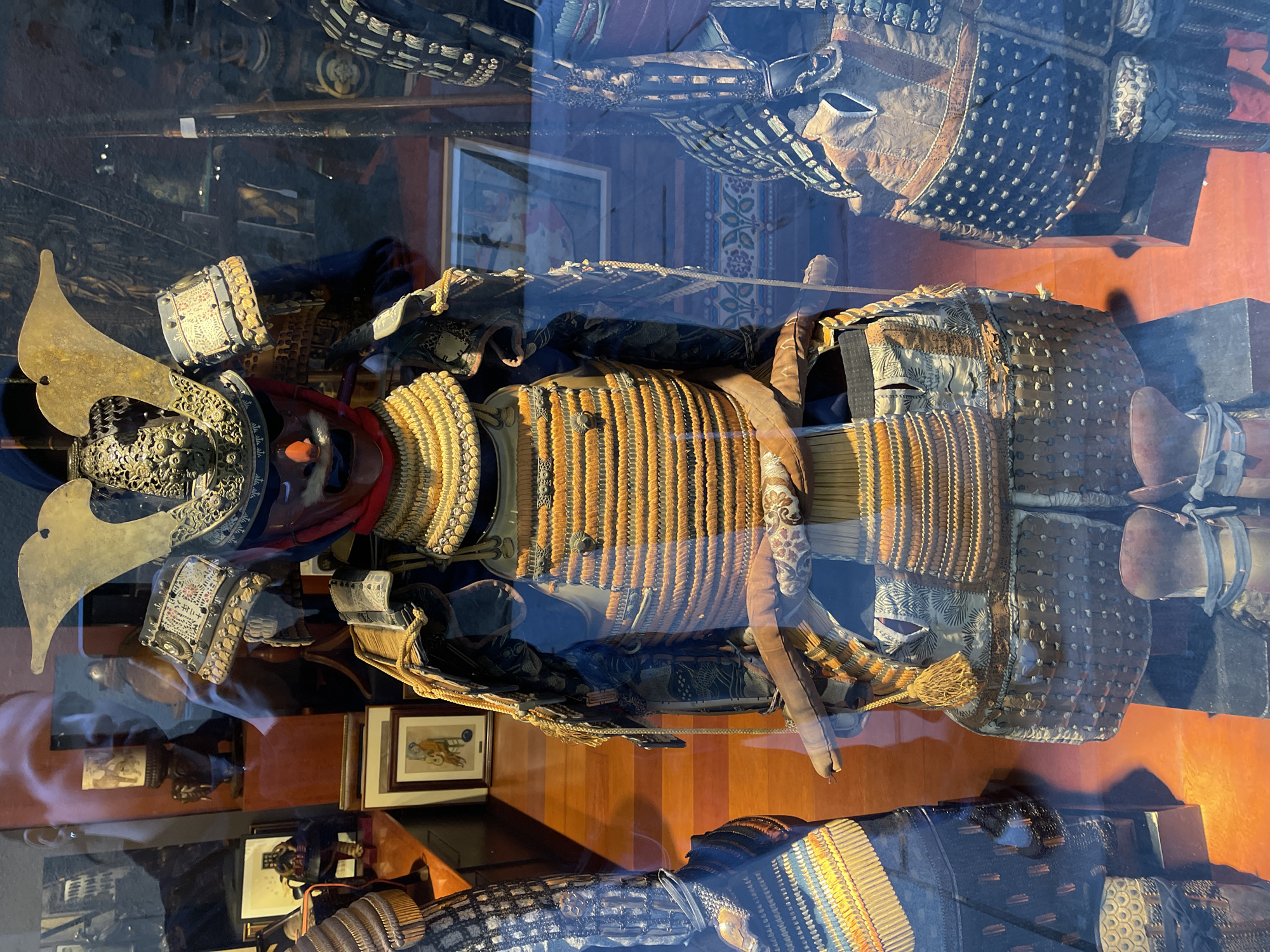 A full Japanese samurai armor set is displayed vertically behind a reflective glass barrier in an indoor setting