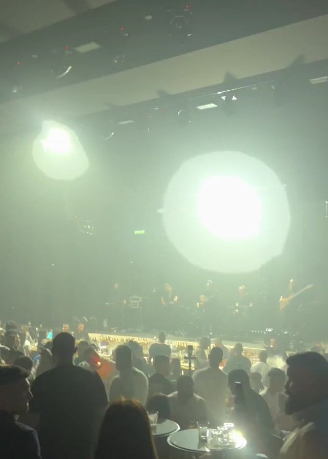 nightclub atmosphere, beginning from a dark perspective of the crowd with a spotlight shining on stage