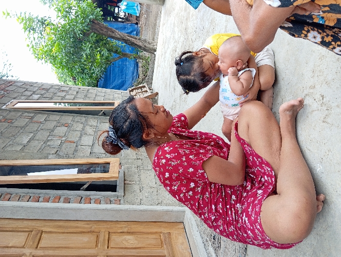 A woman in a floral dress sits on the ground. A child in a yellow shirt kisses a baby held by another person. A building with windows and a wooden door is on the left. A tree and a blue tarp are visible in the background.
