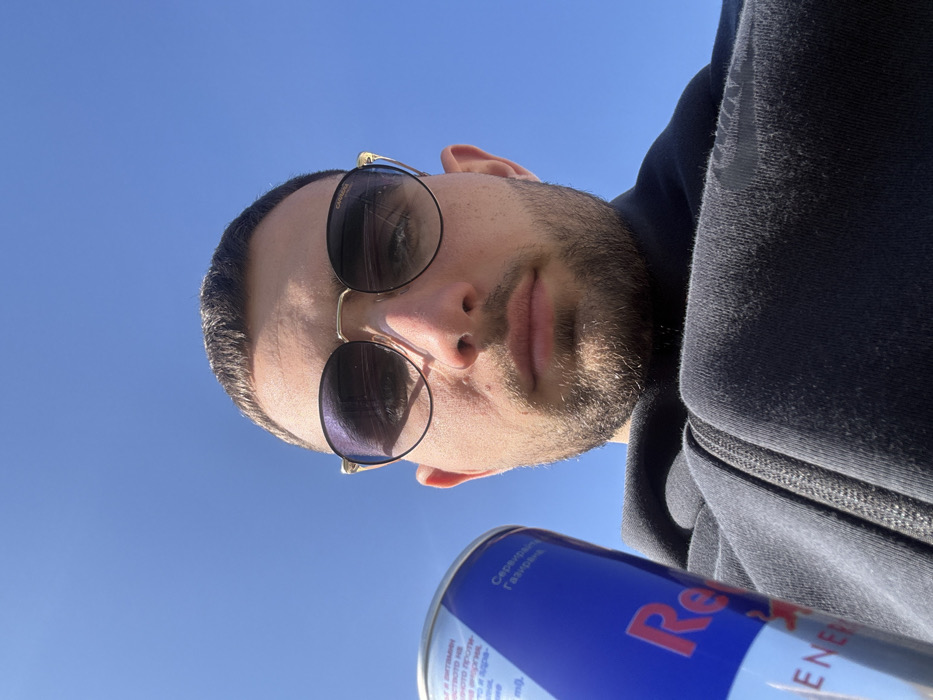 A low-angle, head-and-shoulders portrait captures a male individual outdoors under a clear blue sky. The subject possesses short, dark hair, a beard, and a mustache, maintaining a neutral facial expression while looking directly at the camera. He wears round, gold-rimmed sunglasses, marked "CARRERA" on the right temple. His attire consists of a dark, possibly black or navy, zipped hooded sweatshirt, with a subtle Nike logo visible on the left sleeve. In the left foreground, a blue and silver Red Bull energy drink can is held, partially obstructing the lower left portion of the subject's face and torso. Cyrillic text, including "СЕРВИРАЙТЕ" (SERVE) and "ГАЗИРАНА" (CARBONATED), is visible on the can. The background is a uniform, bright blue sky, providing no identifiable landmarks or environmental features. The precise location within the city of Docha, Bulgaria, cannot be determined from the visual information presented.