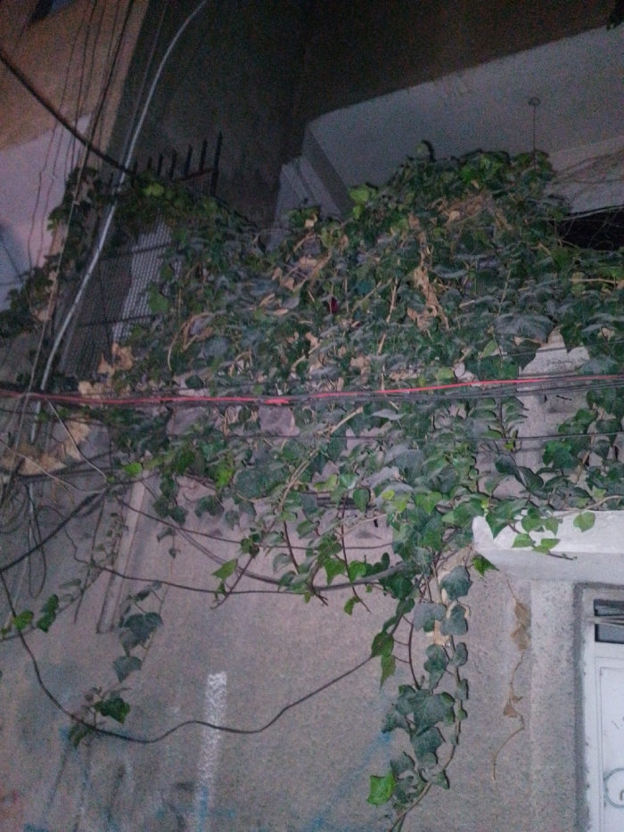 The image displays an exterior architectural scene within Barza Municipality, Syria, captured under low-light conditions. The central focus is a light gray, textured wall, likely concrete or stucco, extensively covered by dense, dark green ivy or similar climbing vegetation. This foliage is particularly thick in the upper and mid-sections, incorporating scattered brown, desiccated leaves. In the upper left, partially obscured by the plants, a dark metal security grating or fence with pointed vertical elements is visible. Multiple black electrical or communication cables traverse the upper and lower left areas, while a distinct red cable runs horizontally across the mid-section of the frame, positioned in front of the vegetation. Towards the lower right, a segment of a white door or window frame is discernible beneath a light-colored, horizontal architectural ledge. No individuals, direct actions, or interactions are present in the scene.