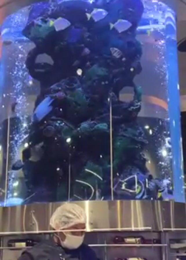 Here's a detailed description of the video: A cylindrical aquarium dominates the frame, filled with water, coral structures, and various fish species. Bubbles rise throughout the tank, illuminated by blue and white lighting. Below the aquarium, a person wearing a white hairnet and a face mask is working at a counter. The counter appears to be part of a bar or service area, as shelves behind it are stocked with bottles of wine. There is a computer on the counter. The person is facing forward and seems to be engaged in a task, potentially related to orders or transactions. The overall environment seems to be a restaurant or upscale venue, suggested by the aquarium and the bar setup. The scene is well-lit.