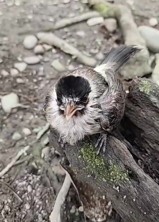 A wet bird with a black head, white chest and dark gray wings and tail, sits on a mossy log, chirping